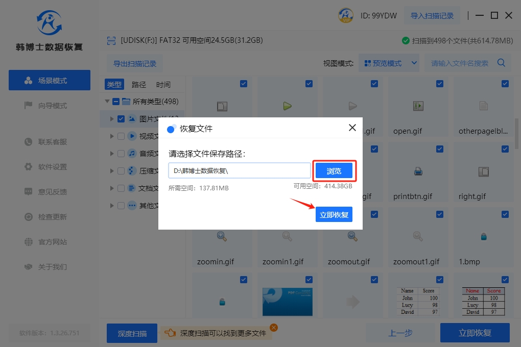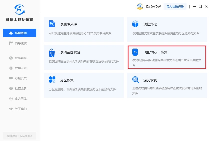 1. 雙擊點開韓博士,進入軟件界面,找到“場景模式”,并選擇“U盤/內存卡恢復”,來執行數據恢復的相關步驟。