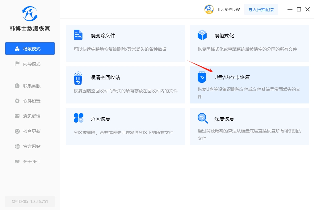 1.雙擊點開韓博士,進入軟件界面,找到“場景模式”,并選擇“U盤/內存卡恢復”,來執行數據恢復的相關步驟。