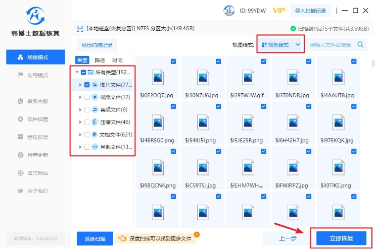 3. 韓博士進行數(shù)據(jù)的掃描操作,這一過程無需您手動操作,只需等待掃描成功即可。掃描完成后,請選擇您需要恢復(fù)的文件,然后點擊“立即恢復(fù)”