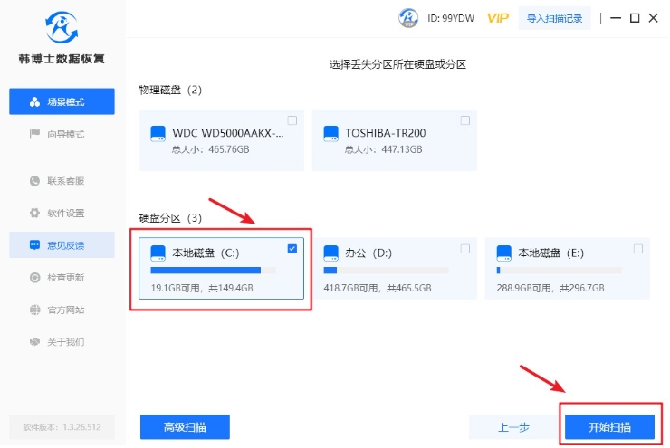 2. 根據(jù)特定的數(shù)據(jù)丟失,請找到硬盤的某個分區(qū),然后單擊“開始掃描”按鈕。