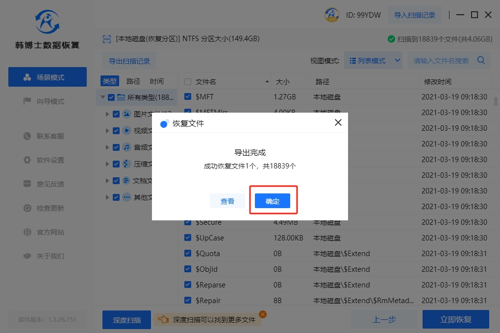 6. 點擊“確定”,這是韓博士恢復硬盤數據的最后一步,確保整個過程被成功恢復。