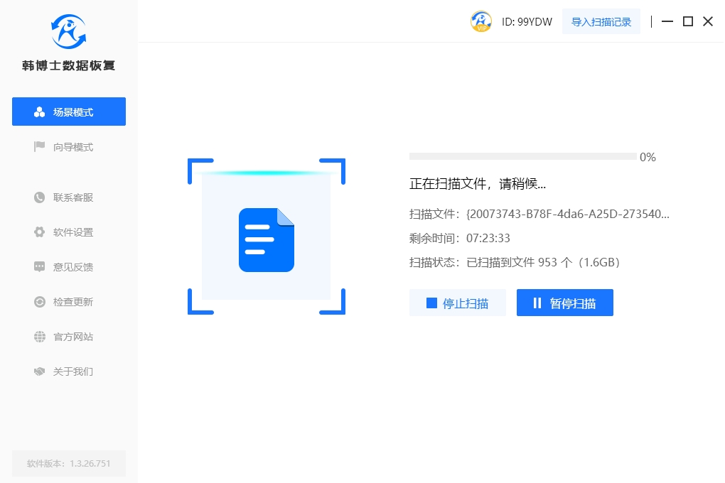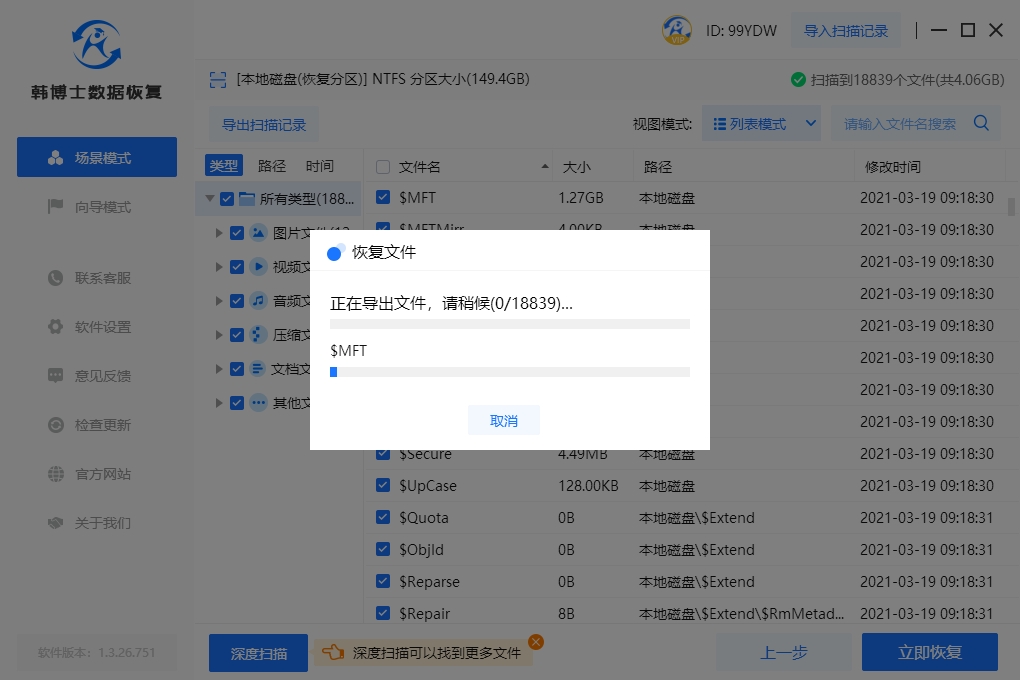 3. 韓博士正在掃描硬盤數據,您不必動手操作,只需耐心等待掃描完畢。等掃描結束后,挑選您需要恢復的文件,然后點一下“立即恢復”,這樣就可以了。