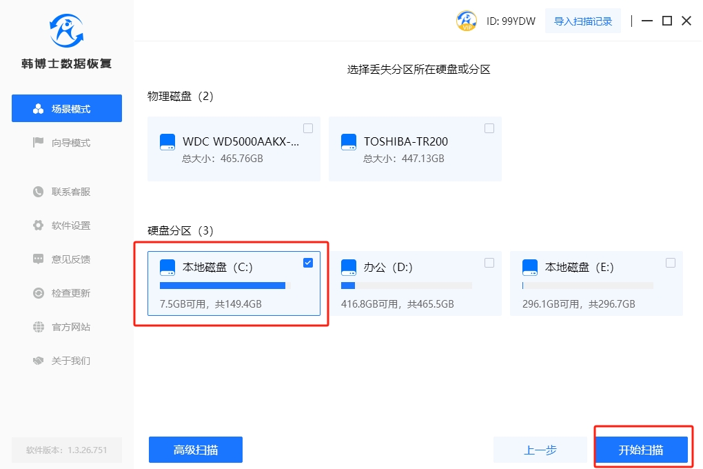 如果連接沒有問題,那就使用數據恢復軟件。只需將韓博士數據恢復安裝到電腦上,然后按照軟件提示操作,掃描你的移動硬盤,很可能就能找回丟失的文件了。