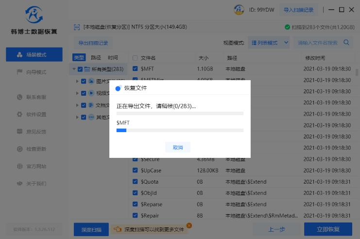 3. 韓博士正在掃描硬盤數據,您不必動手操作,只需耐心等待掃描完畢。等掃描結束后,挑選您需要恢復的文件,然后點一下“立即恢復”,這樣就可以了。