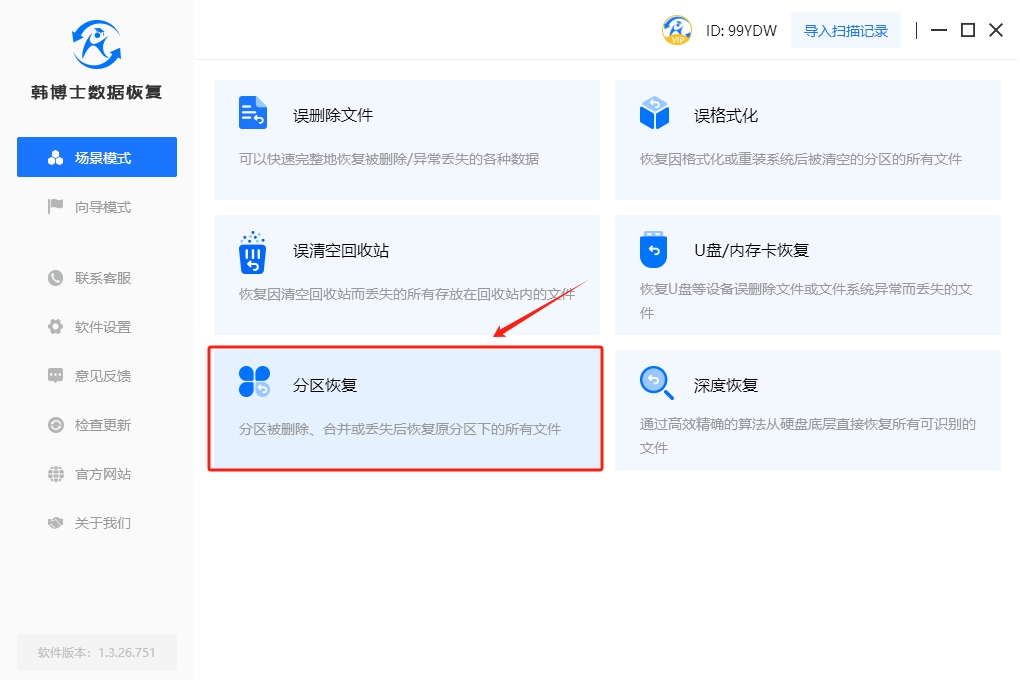 1. 下載并在計算機上安裝好韓博士數(shù)據(jù)恢復(fù),之后選擇“場景模式”下的“分區(qū)恢復(fù)”,再繼續(xù)下一步的恢復(fù)操作。