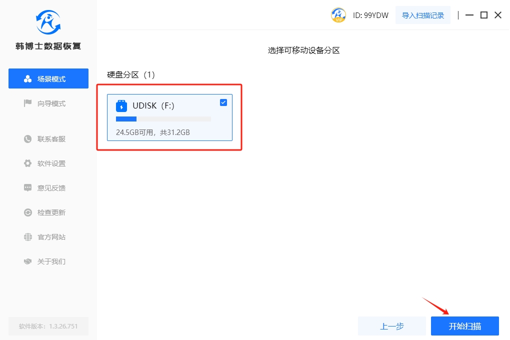 1. 要執行數據恢復操作,首先雙擊打開韓博士,進入軟件界面,然后找到“場景模式”,選擇“U盤/內存卡恢復”。