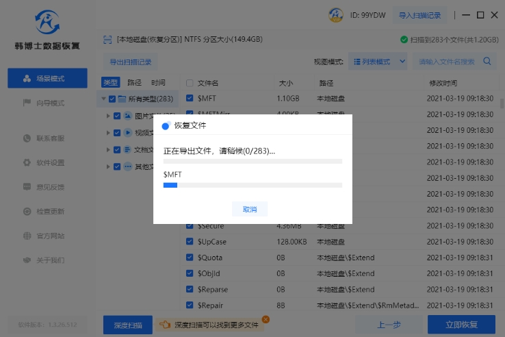 5. 韓博士開始進行恢復和導出數(shù)據(jù),用戶不需要進行任何手動干預,確保整個過程的順利進行。