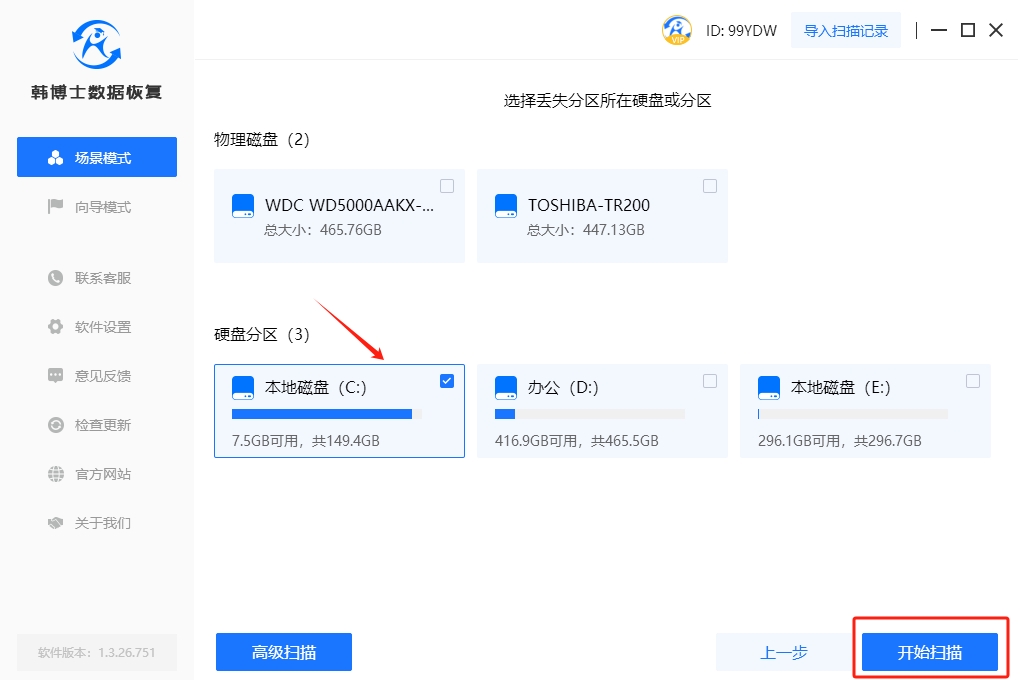 2. 在恢復數(shù)據(jù)前,請確保選擇了正確的硬盤分區(qū),確認無誤后,點擊“開始掃描”,以啟動數(shù)據(jù)掃描流程。
