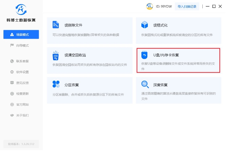 1. 下載并運行韓博士數據恢復,隨后點擊“場景模式”,選擇“U盤/內存卡恢復”以進行相應的操作。