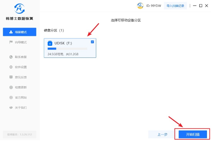 2. 接下來,選擇您插入的可移動(dòng)設(shè)備分區(qū),然后點(diǎn)擊“開始掃描”,進(jìn)入后續(xù)的數(shù)據(jù)掃描步驟。