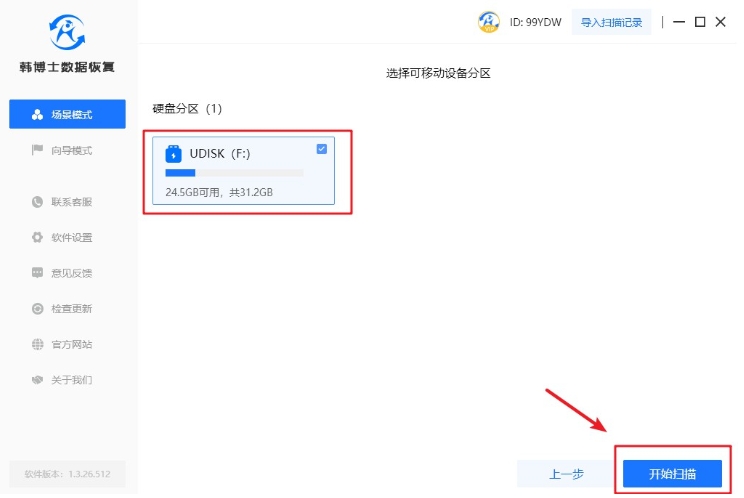 1. 開始恢復前,請先將韓博士數據恢復軟件下載到桌面,并雙擊打開。接著,在界面中找到“場景模式”,然后選擇“U盤/內存卡恢復”。這樣,您就可以開始進行SD卡的數據恢復了。
