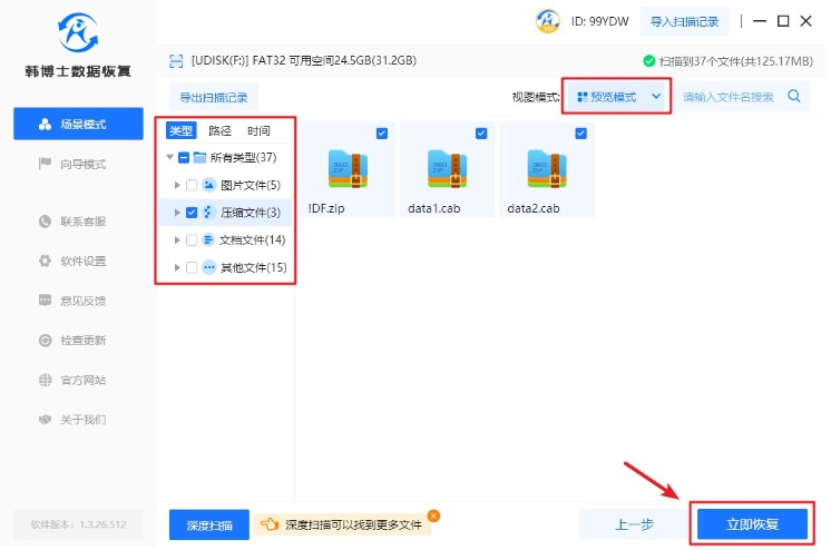 4. 掃描操作結(jié)束后,不要忘記點擊“預(yù)覽模式”,來檢查文件的準(zhǔn)確性。確認(rèn)文件正確無誤后,選中您想要恢復(fù)的文件,然后點擊“立即恢復(fù)”。