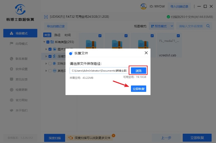 1. 打開韓博士數據恢復軟件,這是內存卡數據恢復的必要步驟。然后,在軟件界面中找到“場景模式”,點擊“U盤/內存卡恢復”。