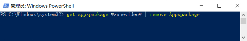 5.在打開的界面中輸入“get-appxpackage *zunevideo* | remove-Appxpackage”回車執行命令,開始卸載播放器。