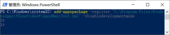 6.卸載完成后,繼續在窗口中輸入“add-appxpackage -register "C:\Program Files\WindowsApps\*ZuneVideo*\AppxManifest.xml" -disabledevelopmentmode”重新安裝應用。