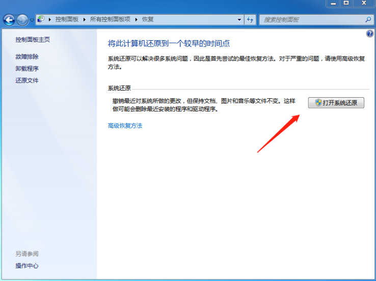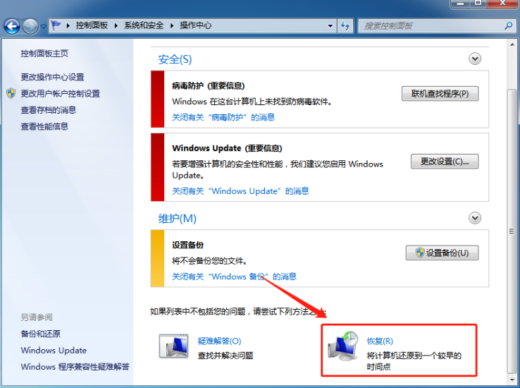 3.打開操作中心界面后,直接點擊右下角處“恢復”進入操作。