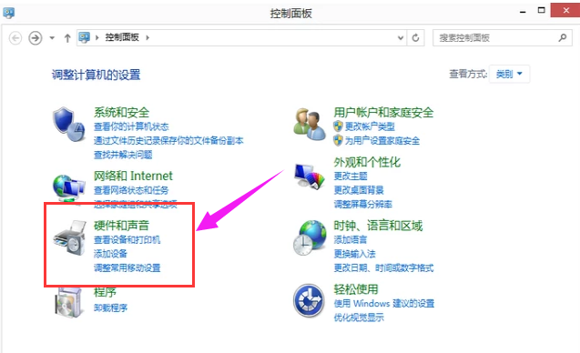 1.打開控制面板,直接在界面中選擇硬件和聲音進入。