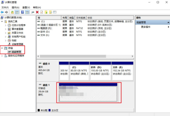 1.打開計算機管理界面,選擇磁盤管理進入,找到其中的U盤。