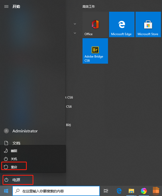 4.最后點擊開始菜單,選擇電源-重啟電腦。