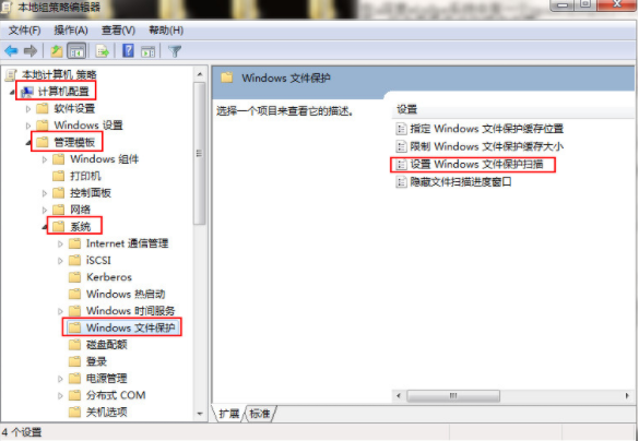 2.出現本地組策略編輯器界面后,直接在界面中依次展開以下選項,最后在右側雙擊打開“設置Windows文件保護掃描”選項。