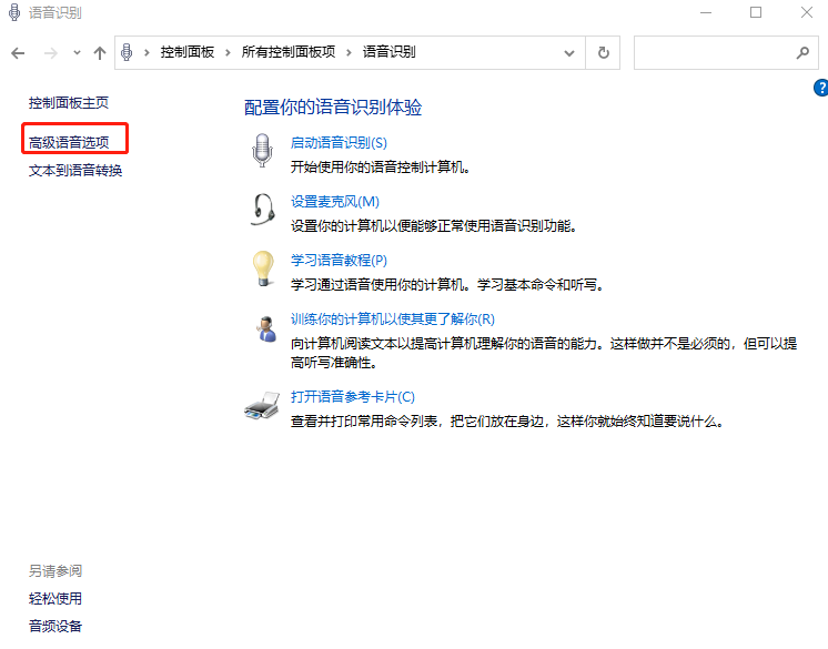 3.在打開的語音識別界面中點擊左側高級語音選項進入。