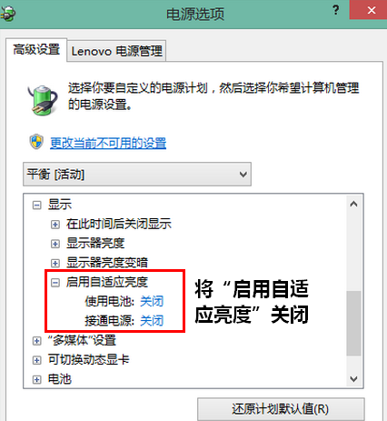 4.找到顯示“啟用自適應(yīng)亮度”,將下面的設(shè)置項(xiàng)全部關(guān)閉,點(diǎn)擊確定即可。