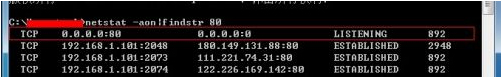 2.在聰明的窗口輸入netstat -aon|findstr 80,80表示要查看的端口號。
