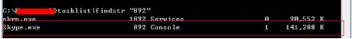4.在cmd中繼續輸入以下命令:tasklist|findstr?"892",892就是之前的進程ID。從下圖中可以看到892對應的是SKYPE程序占用這個端口。