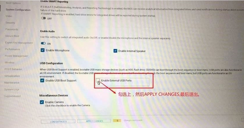3. 進入BIOS,勾選System Configuration右側的Enable External USB Ports,然后點擊APPLY CHANGES,點擊OK,EXIT,退出BIOS,接著正常啟動進入系統即可。