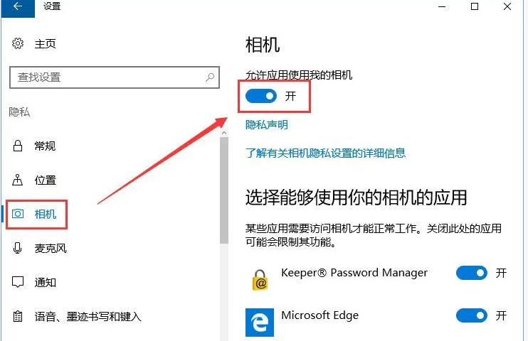 2.點擊“相機(jī)”,將有關(guān)相機(jī)的開關(guān)全部開啟即可。