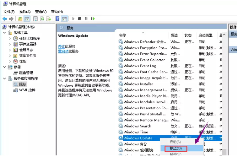 4.右擊 Windows Update 服務項,彈出菜單,選擇“停止”。