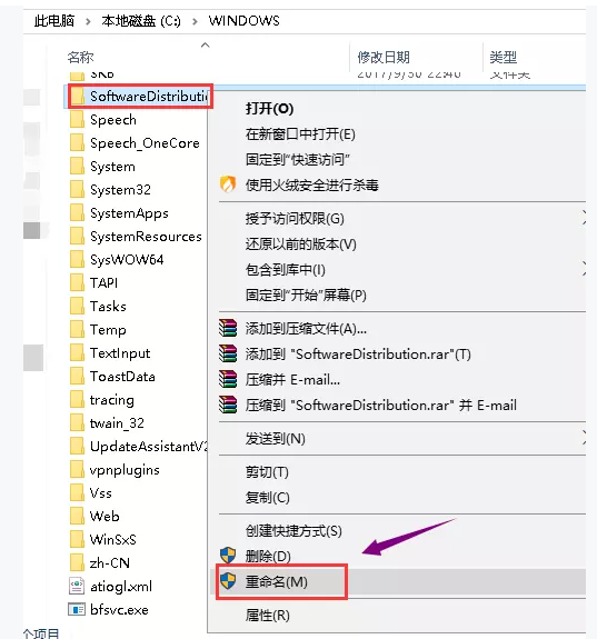6.進入“C:Windows”路徑,找到 SoftwareDistribution 文件夾,對其進行重命名,修改名稱為 SDold。