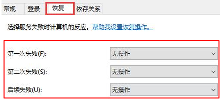4.然后在點(diǎn)擊上方的“恢復(fù)”選項(xiàng)卡,將下方的選項(xiàng)都設(shè)置為“無操作”。設(shè)置好之后,win10就不會自動更新了。