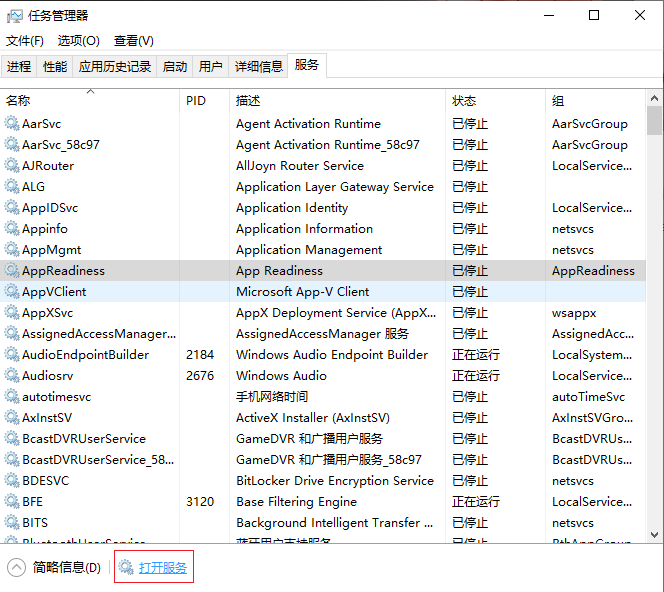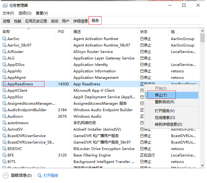 2.點擊“服務”選項,找到“AppReadiness”服務,右鍵點擊,選擇停止