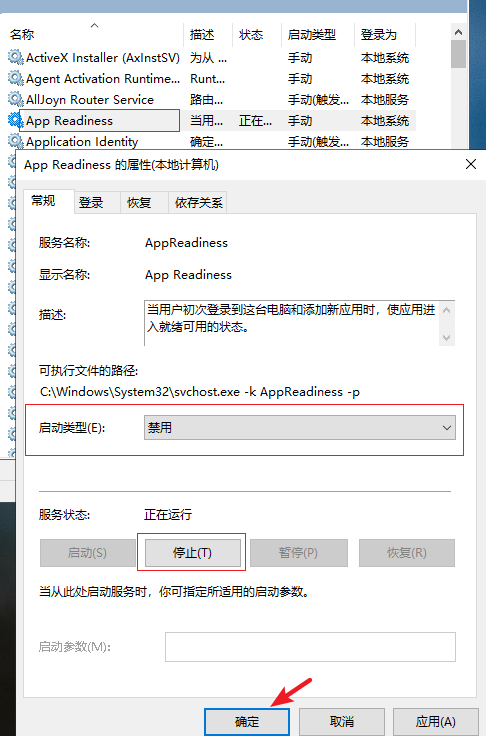 4.找到 “AppReadiness”服務并雙擊,點擊“停止”,啟動類型改為“禁用”,點擊確定,然后重啟電腦即可。