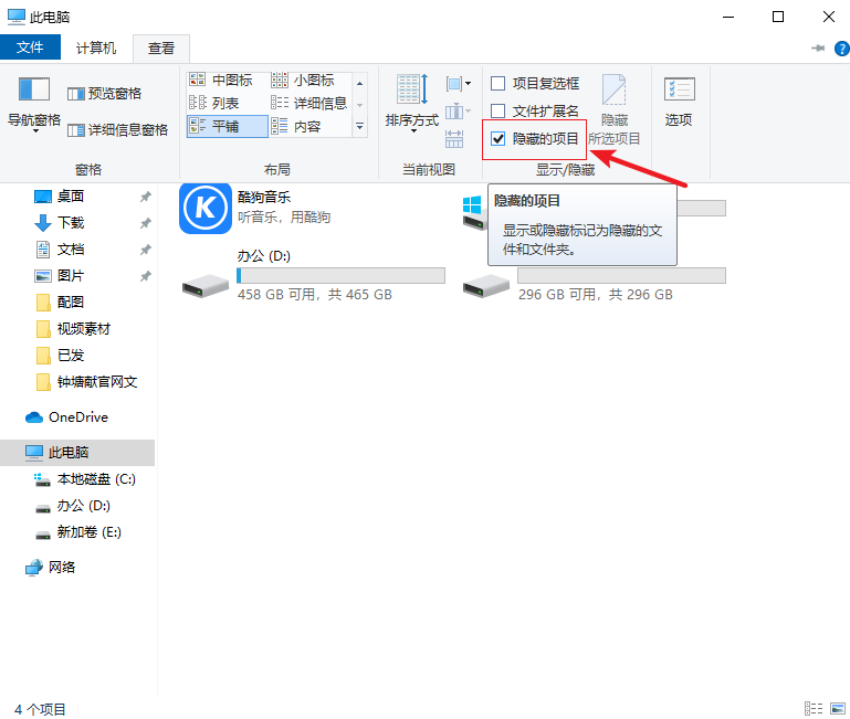 3.在查看的選項下找到【隱藏的項目】,并勾選