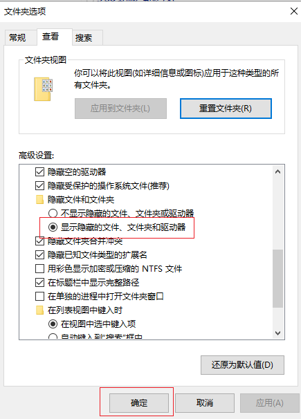 6.在【高級設置】下拉找到【隱藏文件和文件夾】,點開,然后勾選【顯示隱藏的文件、文件夾和驅動器】,最后點擊【確定】即可