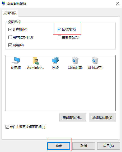 3.在桌面圖標設置界面找到【回收站】并勾選,然后點擊【確定】即可找回回收站。