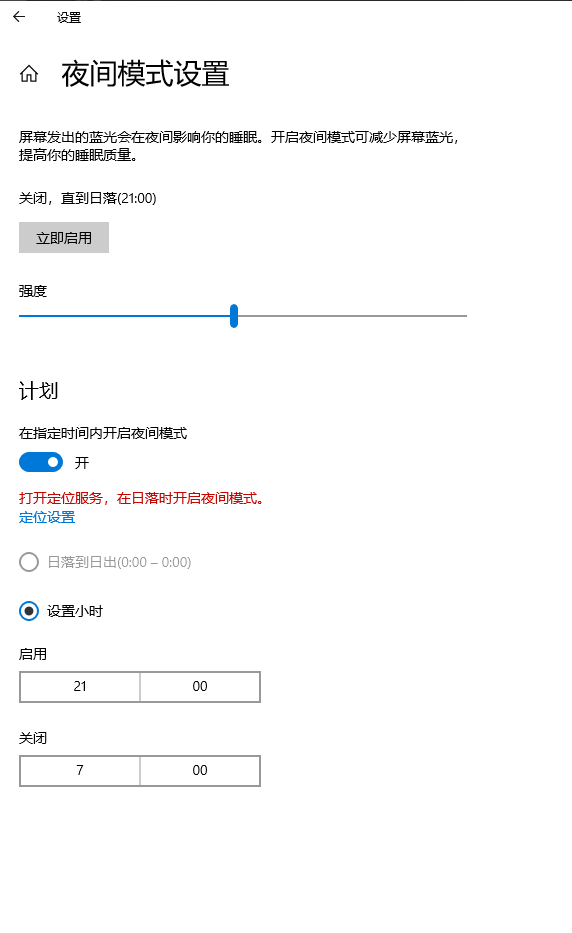 3.點擊【夜間模式設置】,進入之后可根據需要調節強度和設置開啟和關閉的時間等。