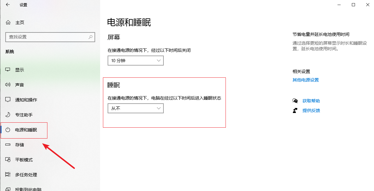 2.進入后在左側選擇【電源和睡眠】,然后在右側【睡眠】下把選項設置為【從不】即可。