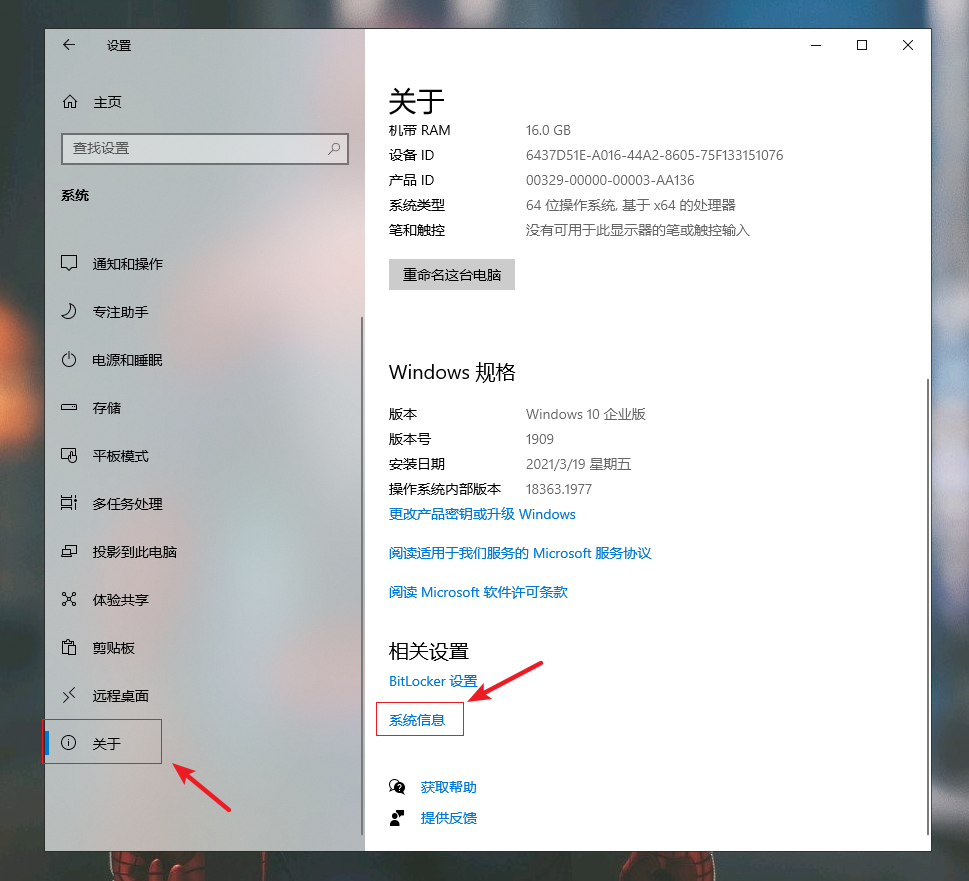 2.進入系統設置界面,在左側下拉找到并點擊【關于】,在右側選擇【系統信息】。