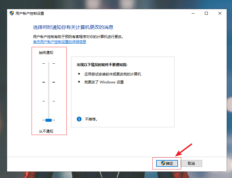 5.把左側藍色色塊拉到底部,然后點擊【確定】即可成功關閉用戶賬戶控制了。