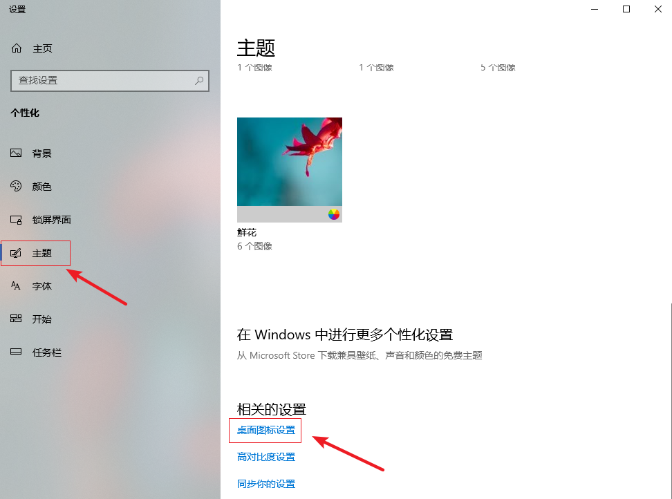 2.進入設置界面,在左側選擇【主題】,然后在右側下拉找到并點擊【桌面圖標設置】。