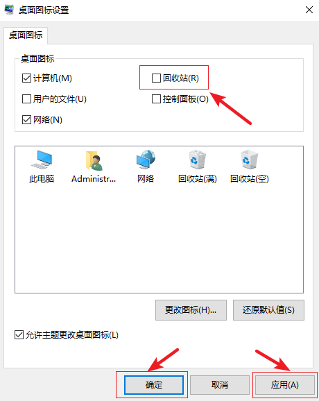 3.在桌面圖標設置界面,把【回收站】起前面的勾去掉,然后依次點擊【應用】-【確定】即可。
