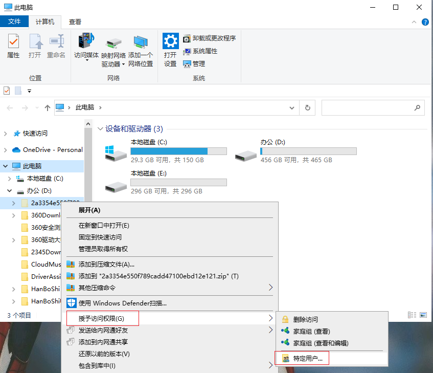 2.進入后選擇要共享的文件夾,然后右鍵打開下拉菜單欄,依次選擇【授權訪問權限】-【特定用戶】。