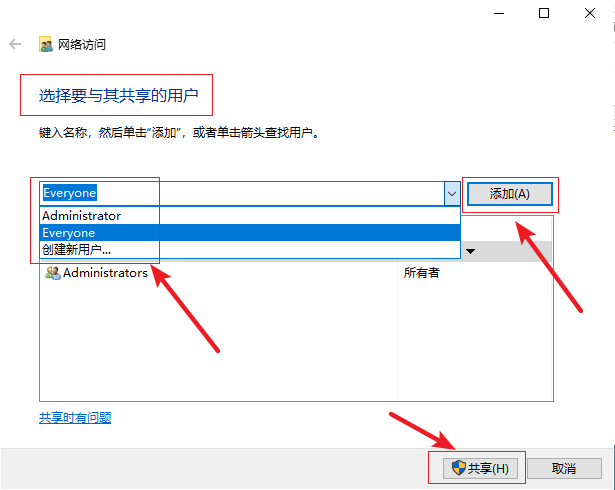 3.在彈出的界面中,在【選擇要與其共享的用戶】下選擇用戶,然后點擊【添加】,最后點擊下方的【共享】按鈕即可。