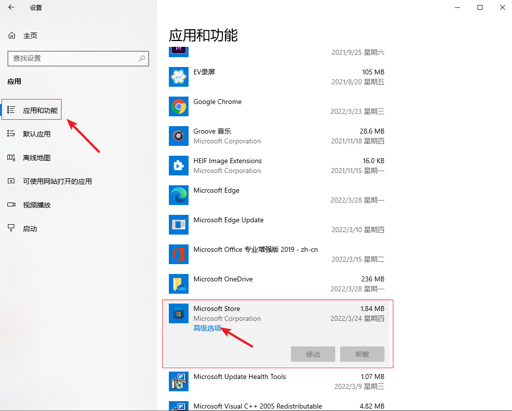 2.進(jìn)入后,在左側(cè)選擇【應(yīng)用和功能】,在右側(cè)下拉找到并點(diǎn)開【Microsoft Store】,選擇【高級選項】。