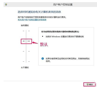 2.進(jìn)入用戶帳戶控制設(shè)置窗口,用鼠標(biāo)把左邊的滑塊往上拉至默認(rèn)的位置,然后點(diǎn)擊【確定】。