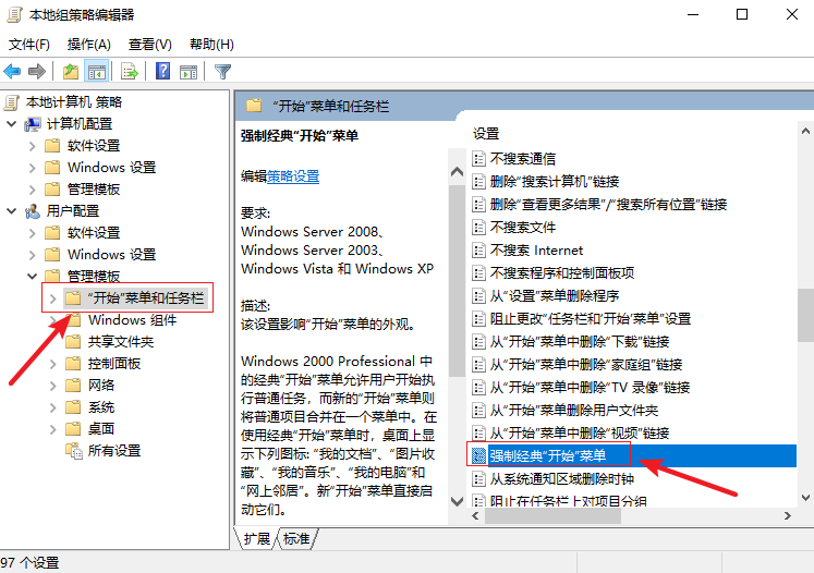 2.進入組策略編輯器界面,在左邊依次點擊【用戶配置】-【管理模板】-【“開始”菜單和任務欄】,然后在右側下拉找到并雙擊【強制經典“開始”菜單】。
