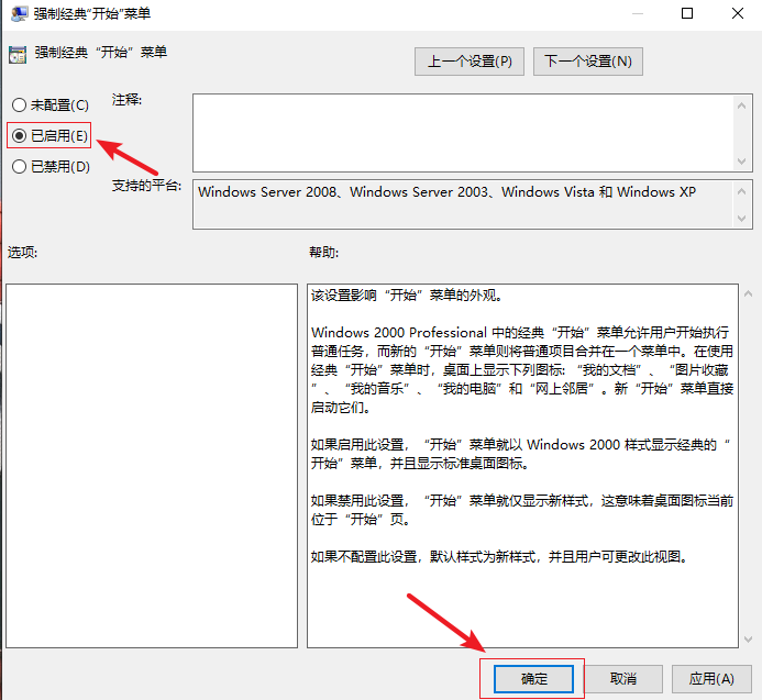 3.進入強制經典“開始”菜單界面,在上方選擇【已啟用】,然后點擊下方的【確定】按鈕即可。